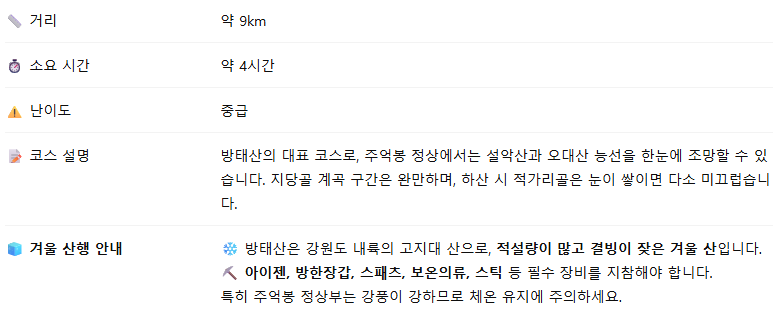개인 구급약품, 여벌 옷, 겨울 트레킹 스틱 등